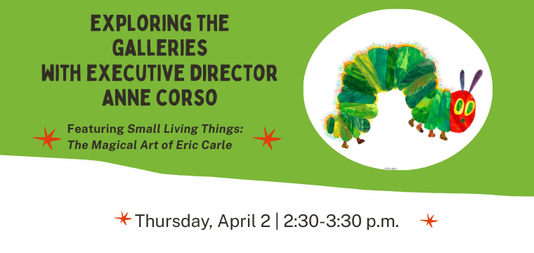 Join Executive Director Anne Corso for a special Gallery Talk as she shares her personal reflections and insights on selected works from Small Living Things: The Magical Art of Eric Carle. Which pieces will she highlight? You’ll have to attend to find out!